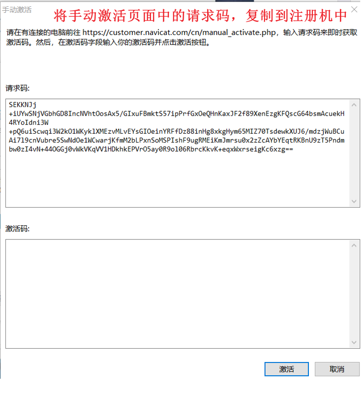 ③ 提示要手動激活,則將請求碼復(fù)制到注冊機中,從而生成激活碼,再復(fù)制粘貼過來激活