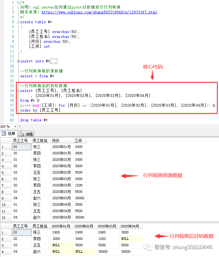 /* 說明:sql server如何通過pivot對(duì)數(shù)據(jù)進(jìn)行行列轉(zhuǎn)換 */ create table #t ( [員工工號(hào)] nvarchar(50), [員工姓名] nvarchar(50), [月份] nvarchar(50), [工資] int ) insert into #t values(N'01', N'張三', N'2020年01月', 2400) ,(N'02', N'李四', N'2020年01月', 3000) ,(N'01', N'張三', N'2020年02月', 2400) ,(N'02', N'李四', N'2020年02月', 3000) ,(N'03', N'王五', N'2020年02月', 5500) ,(N'01', N'張三', N'2020年03月', 2400) ,(N'02', N'李四', N'2020年03月', 1200) ,(N'03', N'王五', N'2020年03月', 5500) ,(N'04', N'趙六', N'2020年03月', 30000) ,(N'01', N'張三', N'2020年04月', 3000) ,(N'03', N'王五', N'2020年04月', 5500) ,(N'04', N'趙六', N'2020年04月', 30000) --行列轉(zhuǎn)換前的源數(shù)據(jù) select * from #t --行列轉(zhuǎn)換后的目標(biāo)數(shù)據(jù) select [員工工號(hào)], [員工姓名] , [2020年01月], [2020年02月], [2020年03月], [2020年04月] from #t D pivot(max([工資]) for [月份] in ([2020年01月], [2020年02月], [2020年03月], [2020年04月])) Q order by [員工工號(hào)] drop table #t