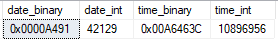 declare @dt datetime = '2015-05-07 10:05:23.187' select substring(convert(varbinary(8), @dt), 1, 4) as date_binary, cast(substring(convert(varbinary(8), @dt), 1, 4) as int) as date_int, substring(convert(varbinary(8), @dt), 5, 4) as time_binary, cast(substring(convert(varbinary(8), @dt), 5, 4) as int) as time_int;