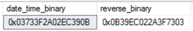 declare @dt datetime2(3)='2015-05-07 10:05:23.187' declare @dt_bi varbinary(max)=convert(varbinary(max), @dt) select @dt_bi as date_time_binary ,convert(varbinary(max),reverse(@dt_bi)) as reverse_binary