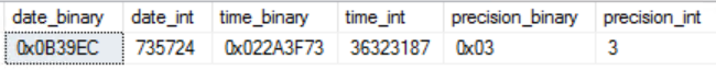 declare @dt datetime2(3)='2015-05-07 10:05:23.187' declare @dt_bi varbinary(max)=convert(varbinary(max), @dt) declare @dt_bi_littleEnd varbinary(max) select @dt_bi_littleEnd=convert(varbinary(max),reverse(@dt_bi)) select substring(convert(varbinary(8), @dt_bi_littleEnd), 1, 3) as date_binary, cast(substring(convert(varbinary(8), @dt_bi_littleEnd), 1, 3) as int) as date_int, substring(convert(varbinary(8), @dt_bi_littleEnd), 4, 4) as time_binary, cast(substring(convert(varbinary(8), @dt_bi_littleEnd), 4, 4) as int) as time_int, substring(convert(varbinary(8), @dt_bi_littleEnd), 8, 1) as precision_binary, cast(substring(convert(varbinary(8), @dt_bi_littleEnd), 8, 1) as int) as precision_int;