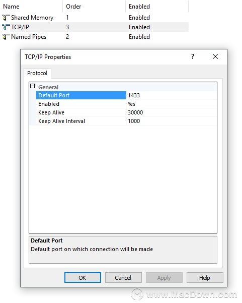 要知道連接的端口,只需單擊TCP / IP即可。在我們的例子中,它是默認(rèn)端口1433。