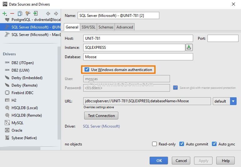 使用Windows身份驗(yàn)證連接到服務(wù)器的另一種方法是使用jTds驅(qū)動(dòng)程序的域身份驗(yàn)證,它允許您從任何其他計(jì)算機(jī)進(jìn)行連接。值得注意的是,它適用于任何操作系統(tǒng)。為此,請轉(zhuǎn)到數(shù)據(jù)源屬性的“高級”選項(xiàng)卡,將USENTLMV2設(shè)置 為true,并在DOMAIN字段中指定域名。
