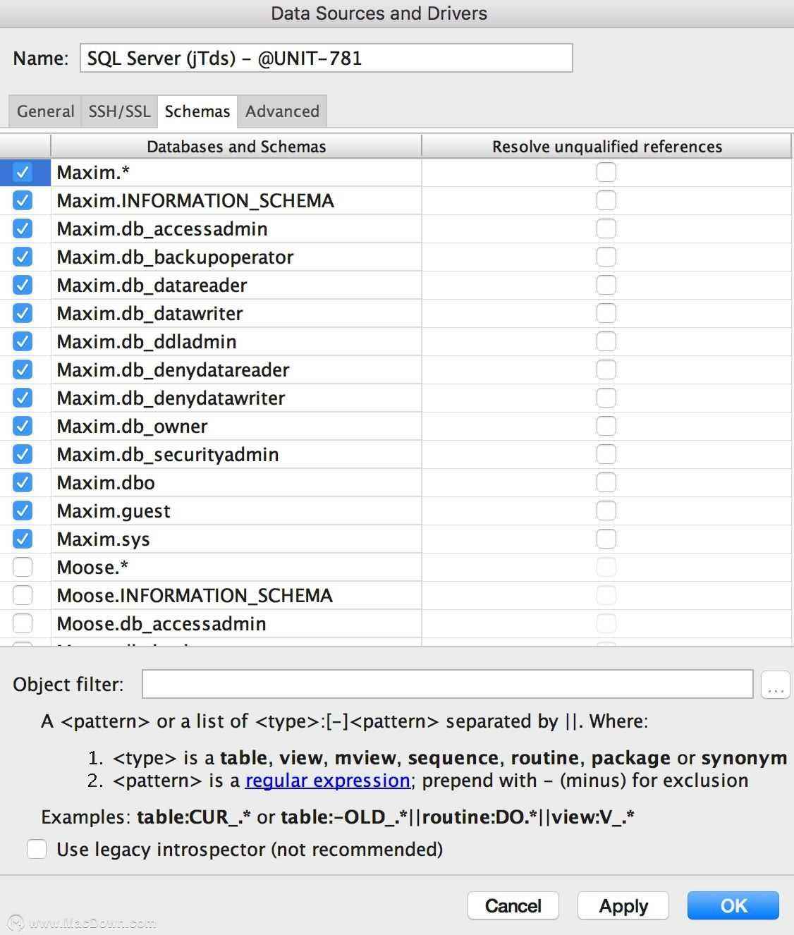 然后在用戶 / 密碼字段中輸入Windows憑據(jù),然后單擊“ 測試連接”。如果要檢查數(shù)據(jù)庫視圖中顯示的特定數(shù)據(jù)庫或模式,請轉(zhuǎn)到數(shù)據(jù)源屬性中的“ 架構(gòu)”選項(xiàng)卡: