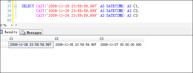 實驗測試驗證,998會轉(zhuǎn)換為997,而'2008-11-26 23:59:59.999'的話,就會轉(zhuǎn)換為'2008-11-27 00:00:00.000',如下截圖所示,所以尤其對數(shù)據(jù)精確性有要求的地方,要注意這些地方,否則SQL語句得出的結(jié)果在邏輯上就有誤。