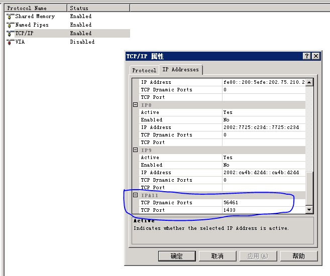 接著滾動(dòng)到最底部, IPALL選項(xiàng)卡里的TCP Port也設(shè)置為1433,TCP Dynamic port不用動(dòng),那個(gè)是自動(dòng)設(shè)置的