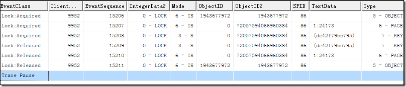 在SQL Server中,我們知道一個SELECT語句執(zhí)行過程中只會申請一些意向共享鎖(IS) 與共享鎖(S), 例如我使用SQL Profile跟蹤會話86執(zhí)行SELECT * FROM dbo.TEST WHERE OBJECT_ID =1 這個查詢語句,其申請、釋放的鎖資源的過程如下所示: