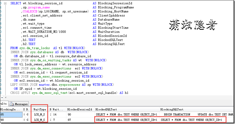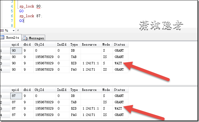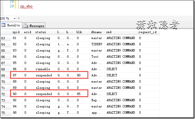 如下所示,你會看到SELECT語句“阻塞”了SELECT語句,即會話90“阻塞”了會話87, 它們的等待事件都為LCK_M_S,也就是說它們都在等待獲取共享鎖,也許你會置疑這個SQL是否有問題,那么我們使用SP_WHO來查看,你會發(fā)現(xiàn)也是如此,如下所示: