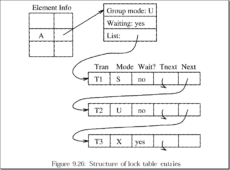 其實(shí)應(yīng)該說,會話87、90都在等待RID對象的共享鎖,我們知道共享鎖與意向共享鎖都是兼容的,所以SELECT是不會阻塞SELECT的,那么又怎么解釋這個現(xiàn)象呢?在宋大神的指點(diǎn)下,粗略的翻了Database System Implementaion這本書(很多原理性知識,看起來相當(dāng)吃力)。里面介紹了在鎖表(lock table)以及Element Info、Handling Lock Requests、Handling Unlocks等概念,有一個有意思的圖所示,
