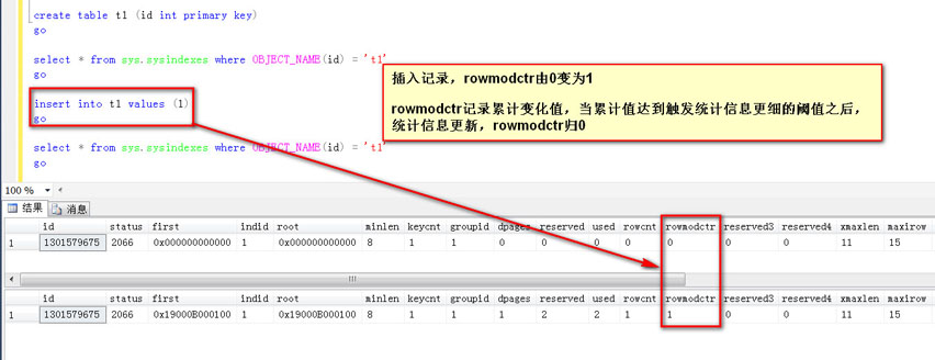 做個(gè)查詢,觸發(fā)統(tǒng)計(jì)信息更新,rowmodct歸0(繼續(xù)累積直到下一個(gè)觸發(fā)的閾值,觸發(fā)更新之后再次歸0)