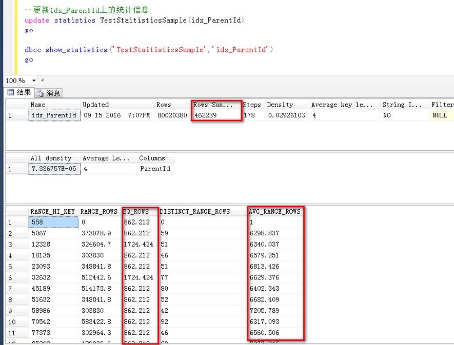 測(cè)試數(shù)據(jù)寫入,以及所創(chuàng)建完成之后來更新idx_ParentId 索引上的統(tǒng)計(jì)信息,就按照默認(rèn)的方式來更新,然后來觀察統(tǒng)計(jì)信息