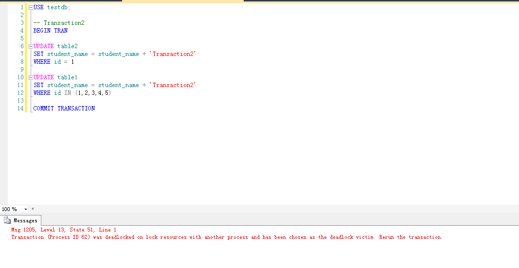 USE testdb; -- Transaction2 BEGIN TRAN UPDATE table2 SET student_name = student_name + 'Transaction2' WHERE id = 1 UPDATE table1 SET student_name = student_name + 'Transaction2' WHERE id IN (1,2,3,4,5) COMMIT TRANSACTION