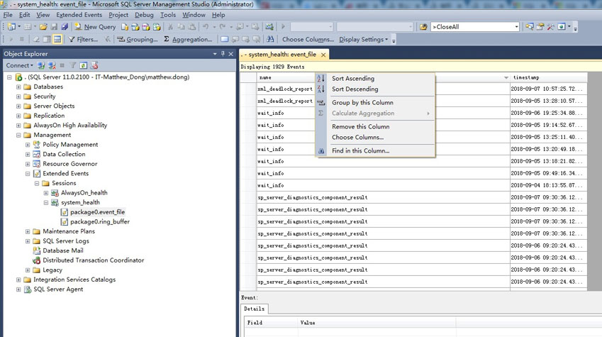 依次點(diǎn)擊Management -> Extended Events - >system health - >package0.event_file
