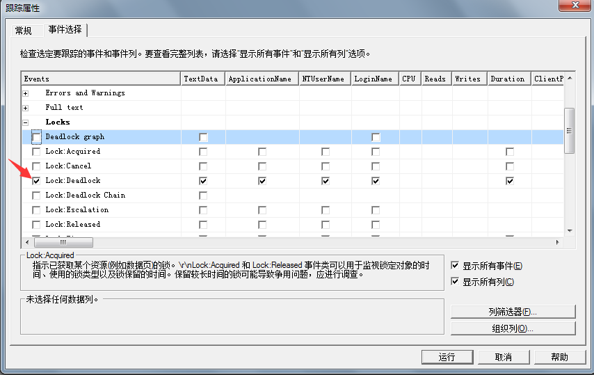 sqlserver -->工具--> sql server profiler 登錄后在跟蹤屬性中選擇如下圖: