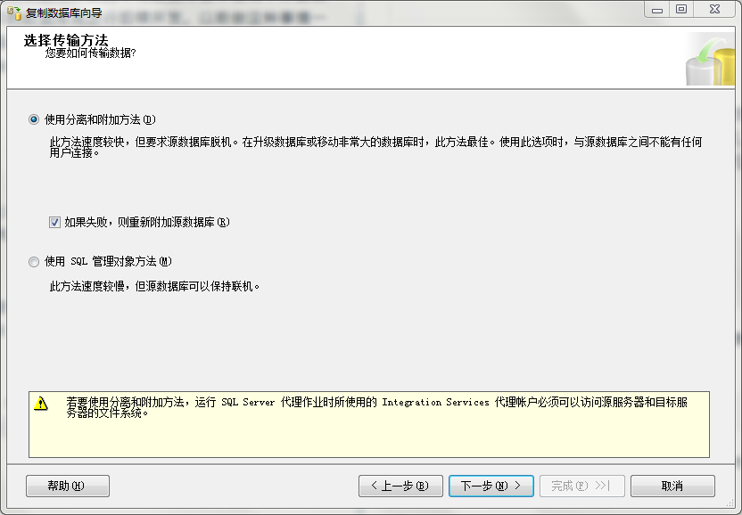 “若要使用分離和附加方法,運行SQL Server代理作業(yè)時所使用的Integration Services代理賬戶必須可以訪問源服務器和目標服務器的文件系統(tǒng)”