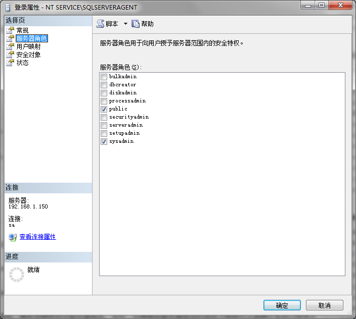 在SSMS的安全性——用戶名中可以找到該用戶,點開用戶屬性,發(fā)現(xiàn)只有sysadmin和public角色,沒有diskadmin角色