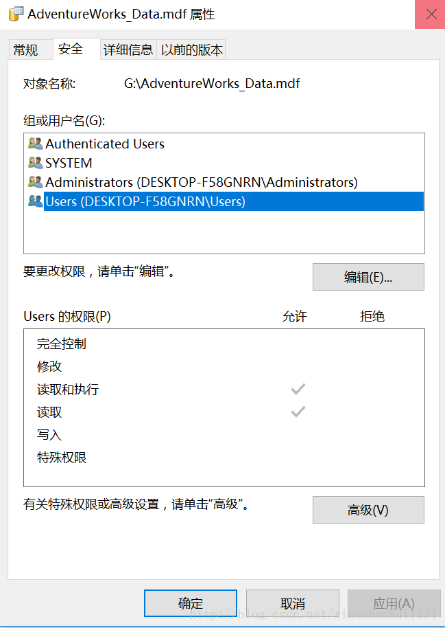 查看消息后發(fā)現(xiàn)錯(cuò)誤代碼為5120 解決方法1(嘗試):把數(shù)據(jù)庫登陸方式改為Windows身份認(rèn)證,然后再試一下; 解決方法2:查看一下數(shù)據(jù)庫文件的屬性->安全標(biāo)簽,發(fā)現(xiàn)