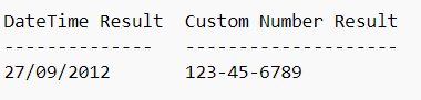 FORMAT(123456789,'###-##-####') AS 'Custom Number Result