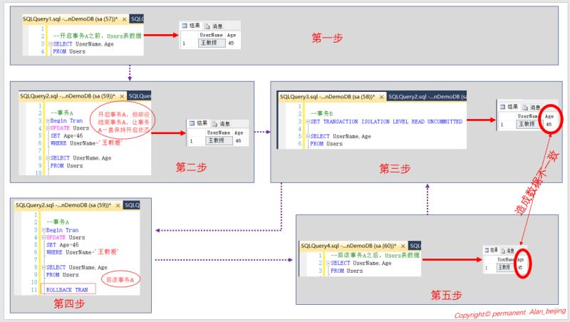 那么也就是說,在這個(gè)事務(wù)隔離級(jí)別,讀操作可以與寫操作同時(shí)進(jìn)行,互不排斥,讀操作可以讀取寫操作未提交的修改,從而造成數(shù)據(jù)的不一致性,這種情況,我們稱