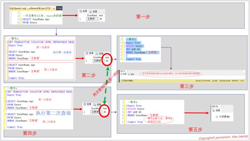 為了防止不可重復(fù)讀現(xiàn)象,SQL Sever中采用隔離級(jí)別升級(jí)的方式,即將已提交讀升級(jí)為可重復(fù)讀。在可重復(fù)讀隔離級(jí)別下,事務(wù)中的讀操作不僅能獲得共享鎖,