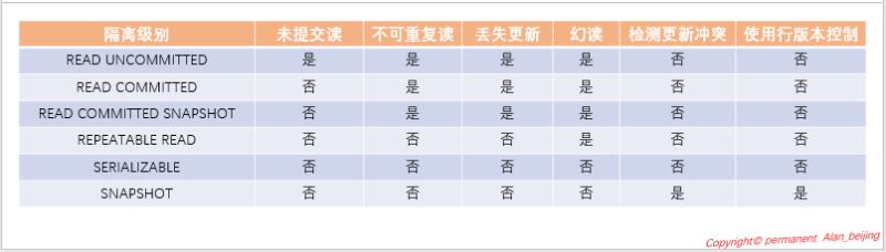 下表總結(jié)了每種隔離級(jí)別與邏輯一致性問題,檢測(cè)沖突和行版本控制之間關(guān)系