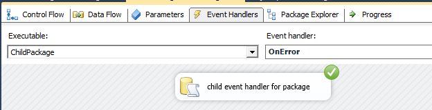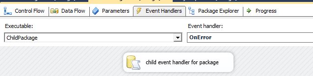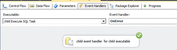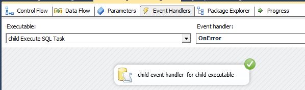 默認(rèn)情況下,當(dāng)前Task組件的事件處理程序中把錯誤(Error)事件處理之后,SSIS引擎仍然把錯誤事件向上層事件處理程序傳遞,直到包層次結(jié)構(gòu)的最頂層,如下圖,在ChildPackage的Package級別和Executable級別上分別創(chuàng)建了OnError事件處理程序,Executable級別是child Execute SQL Task: