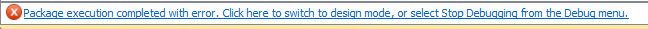但是,錯誤事件沒有停止,而是繼續(xù)向上傳遞,被其直接上級,也就是Package級別的OnError事件處理程序捕獲,如下圖,來自子Task組件的錯誤事件被父級處理之后,Package仍然報錯,錯誤消息是:Package execution completed with error.