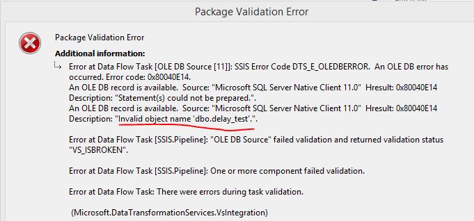 設置Package Level的屬性DelayValidation=False,Task Level的屬性DelayValidation=False,在Data Flow Task中,OLE DB Source組件從一個當前不存在的表dbo.delay_test中selelct數(shù)據(jù):