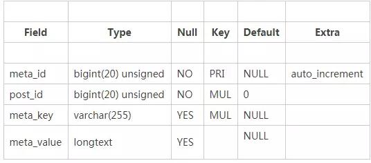 MySQL有一個(gè)很方便的語(yǔ)句DESCRIBE,它可以輸出表結(jié)構(gòu)的信息,比如字段名,數(shù)據(jù)類(lèi)型等等。所以,當(dāng)你執(zhí)行DESCRIBE wp_postmeta;你將會(huì)看到如下的結(jié)果: