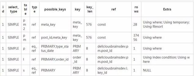 Explain也給了我們很多可以?xún)?yōu)化的信息。例如,pm2表((wp_postmeta),告訴我們是Using filesort,因?yàn)槲覀兪褂昧?ORDER BY語(yǔ)句對(duì)結(jié)果進(jìn)行了排序。如果我們要對(duì)查詢(xún)結(jié)果進(jìn)行分組,這將會(huì)給執(zhí)行增加開(kāi)銷(xiāo)。