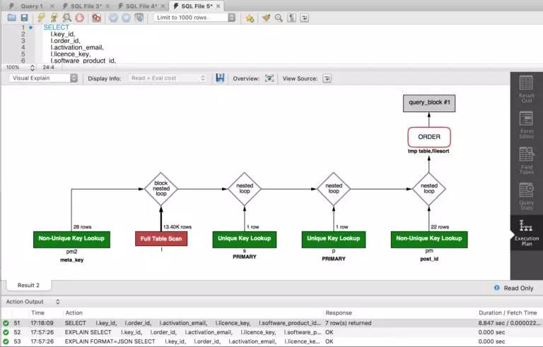 你應(yīng)該避免(https://dev.mysql.com/doc/refman/5.7/en/table-scan-avoidance.html)這種全部表瀏覽的查詢(xún),因?yàn)樗褂梅撬饕侄蝟rder_id去連接wp_woocommerce_software_licences表和wp_posts表。這對(duì)于查詢(xún)慢是常見(jiàn)的問(wèn)題,而且也是比較容易解決的問(wèn)題。