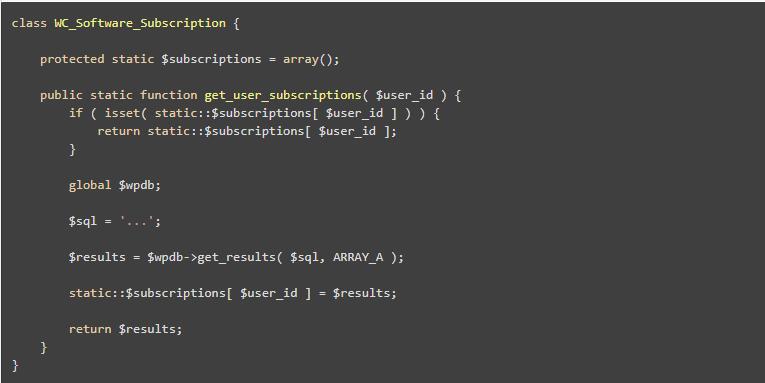 你的PHP 代碼中的靜態(tài)緩存很簡(jiǎn)單并且可以很高效的解決這個(gè)問(wèn)題?;旧希状握?qǐng)求時(shí)從數(shù)據(jù)庫(kù)中獲取查詢(xún)結(jié)果,并將其存儲(chǔ)在類(lèi)的靜態(tài)屬性中,然后后續(xù)的查詢(xún)語(yǔ)句調(diào)用將從靜態(tài)屬性中返回結(jié)果: