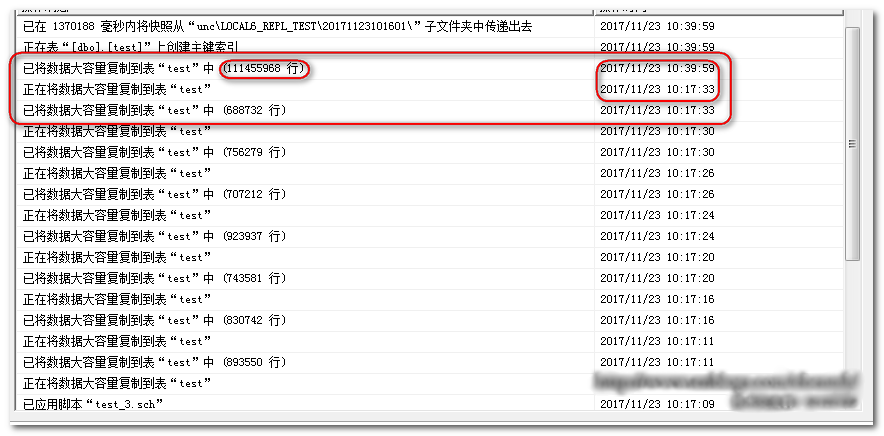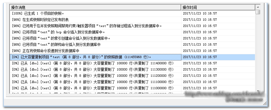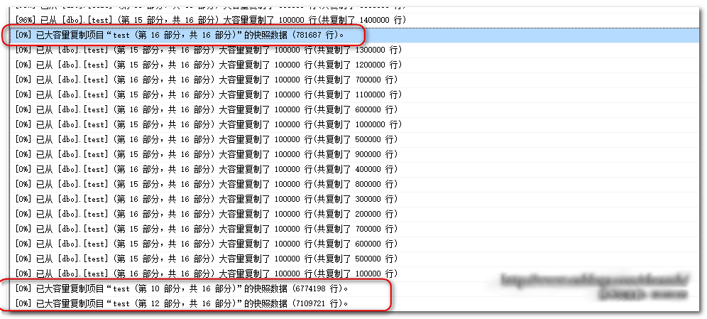 從2008R2分發(fā)記錄過程中可以看到每次BULK都是以bcp文件為單位,復(fù)制最后一個bcp文件花費(fèi)了大概22分鐘,而前面的每個文件都是十幾秒;還是由于我當(dāng)前的表只有三個字段而且除了主鍵沒有索引否則的時間就更長了。
