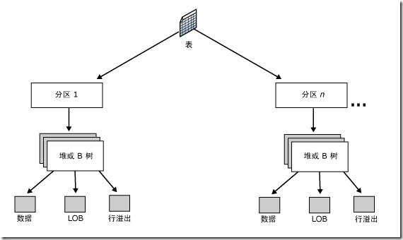 下圖顯示了表的存儲(chǔ)組織,每張表有一個(gè)對應(yīng)的對象ID,并且包含一個(gè)或多個(gè)分區(qū),每個(gè)分區(qū)會(huì)有一個(gè)堆或者多個(gè)B樹,堆或者B樹的結(jié)構(gòu)是預(yù)留的。每個(gè)堆或者是B樹都有三個(gè)分配單元用來存放數(shù)據(jù),分別是數(shù)據(jù)、LOB、行溢出,使用最多的分配單元是數(shù)據(jù)。如果有LOB數(shù)據(jù)或者是長度超過8000字節(jié)的記錄,則可能有另外的LOB分配單元和行溢出分配單元。