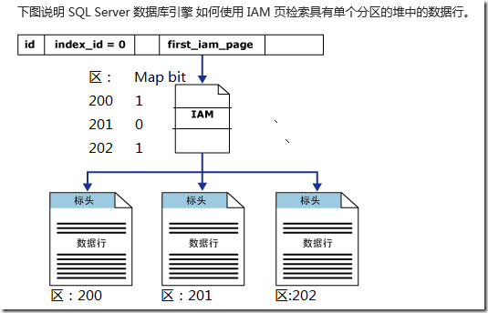 sys.system_internals_allocation_units系統(tǒng)視圖中的列first_iam_page指向管理特定分區(qū)中堆的分配空間的一系列 IAM 頁的第一頁。SQL Server 使用 IAM 頁在堆中移動(dòng)。堆內(nèi)的數(shù)據(jù)頁和行沒有任何特定的順序,也不鏈接在一起。數(shù)據(jù)頁之間唯一的邏輯連接是記錄在 IAM 頁內(nèi)的信息。