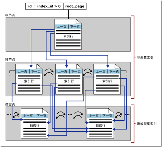 如果有一個(gè)表只有非聚集索引而沒有聚集索引,對應(yīng)的索引號是2--250。那么針對每個(gè)非聚集索引,都有一個(gè)對應(yīng)的分區(qū),在系統(tǒng)表進(jìn)而,對于這個(gè)分區(qū)下面的每個(gè)分配單元,都有一個(gè)連接指向根頁。數(shù)據(jù)頁之間通過前后指針互相聯(lián)系,是一個(gè)完整的樹形結(jié)構(gòu)。在樹的底層,會(huì)有一個(gè)連接指向真正的數(shù)據(jù),連接的形式是文件號+頁號+行號,而真正的數(shù)據(jù)是以堆的形式存放的。如下圖所示: