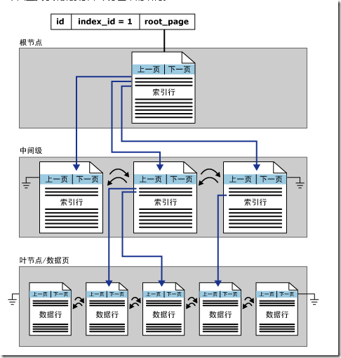 表中的聚集索引,對應(yīng)的索引號是1。它有一個(gè)對應(yīng)的分區(qū),該分區(qū)下的每個(gè)分配單元都有一個(gè)連接指向根頁。對于聚集索引來說,葉子結(jié)點(diǎn)里存放的是真正的數(shù)據(jù),而不是非聚集索引那樣的連接。如下圖所示: