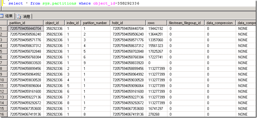 從上圖可以看到,此表共有16個(gè)分區(qū),對應(yīng)不同的索引,基本上每個(gè)分區(qū)都有1千多萬條記錄。從此圖中還可以看到堆或者B樹的ID跟分區(qū)ID是一樣的,如果希望進(jìn)一步查看某一個(gè)索引的具體信息,可以使用下面的命令,如查看72057594067419136的信息。