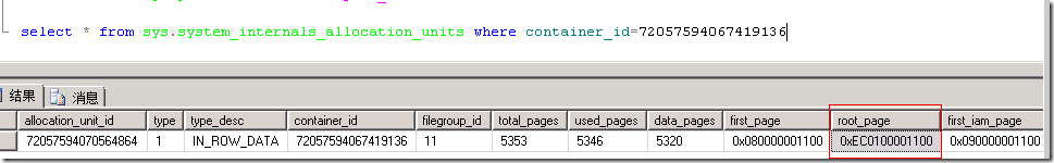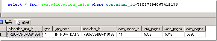 從這個(gè)圖當(dāng)中,我們可以看到這個(gè)分區(qū)只有一個(gè)分配單元,IN_ROW_DATA表明此分配單元只用來存放具體數(shù)據(jù),共5353頁,已使用5346頁,數(shù)據(jù)占用5320頁。