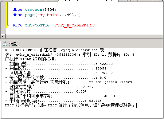 從中可以看到具體的數(shù)據(jù),此界面的返回結(jié)果會(huì)因表上的聚集索引、非聚集索引而不同。如果查看一個(gè)表使用的總頁數(shù)和區(qū)數(shù),也可以使用命令:DBCC SHOWCONFIG,如下圖所示: