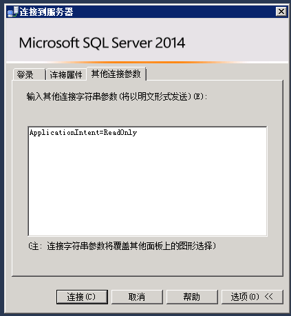 輔助數(shù)據(jù)庫僅接受ApplicationIntent=ReadOnly的連接,其它的連接方式無法連接。