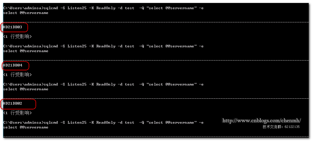 當(dāng)HD21DB01作為主節(jié)點(diǎn)時,HD21DB02,HD21DB03,HD21DB04平均分?jǐn)傋x的壓力,當(dāng)HD21DB02,HD21DB03,HD21DB04都無法訪問時讀連接訪問HD21DB01;演示如下: