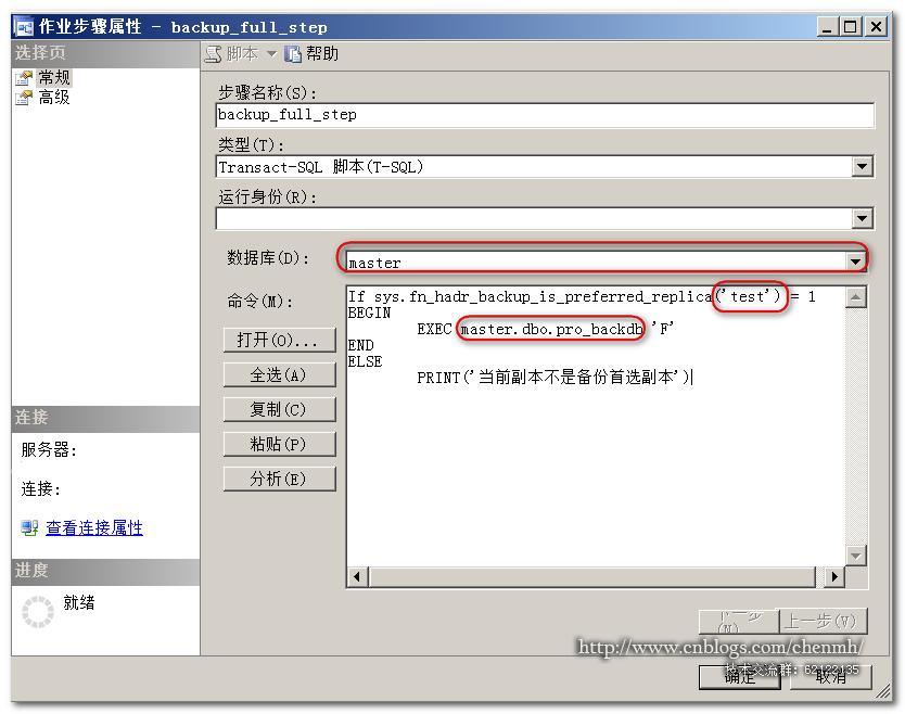 1.這里的數(shù)據(jù)庫要選擇“master”,如果當(dāng)前的alwayson配置了只讀路由而你這里選擇的是可用性數(shù)據(jù)庫的話那么在輔助副本上面創(chuàng)建的作業(yè)會執(zhí)行失敗,因為只讀路由連接輔助副本可用性數(shù)據(jù)庫需要readonly連接屬性。創(chuàng)建非備份的其它作業(yè)也是一樣。