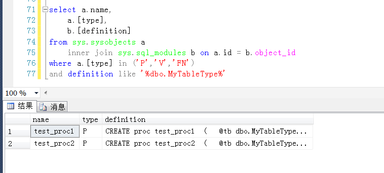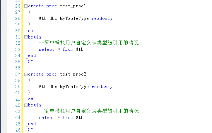創(chuàng)建兩個(gè)存儲(chǔ)過(guò)程,分別用到了上面定義的用戶自定義表類型,模擬用戶自定義表類型被引用的情況