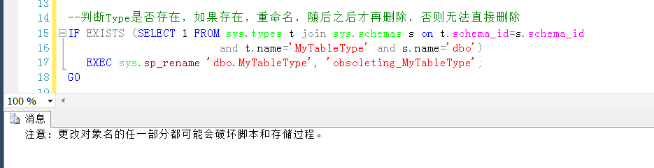 可以先將自定義的某個(gè)TableType重命名,重命名的過(guò)程中有一個(gè)警告,這里先忽略它,隨后可以直接Drop Type dbo.MyTableType