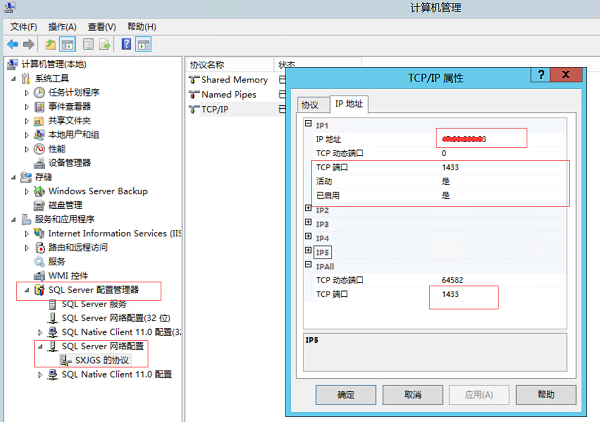 2. 服務(wù)器上 win + R 鍵入 compmgmt.msc ,打開 計(jì)算機(jī)管理,按照如圖所示 設(shè)置。注:IPAll 一欄 TCP端口必須設(shè)置,不然連接不上?。?! 設(shè)置完成后,重啟一下 Sql Server 服務(wù)。