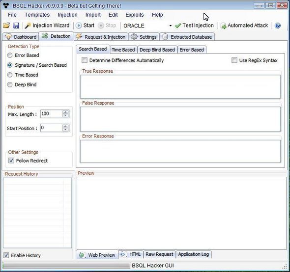 BSQL Hacker是由Portcullis實(shí)驗(yàn)室開發(fā)的,BSQL Hacker 是一個(gè)SQL自動(dòng)注入工具(支持SQL盲注),其設(shè)計(jì)的目的是希望能對(duì)任何的數(shù)據(jù)庫進(jìn)行SQL溢出注入。 BSQL Hacker的適用群體是那些對(duì)注入有經(jīng)驗(yàn)的使用者和那些想進(jìn)行自動(dòng)SQL注入的人群。BSQL Hacker可自動(dòng)對(duì)Oracle和MySQL數(shù)據(jù)庫進(jìn)行攻擊,并自動(dòng)提取數(shù)據(jù)庫的數(shù)據(jù)和架構(gòu)。