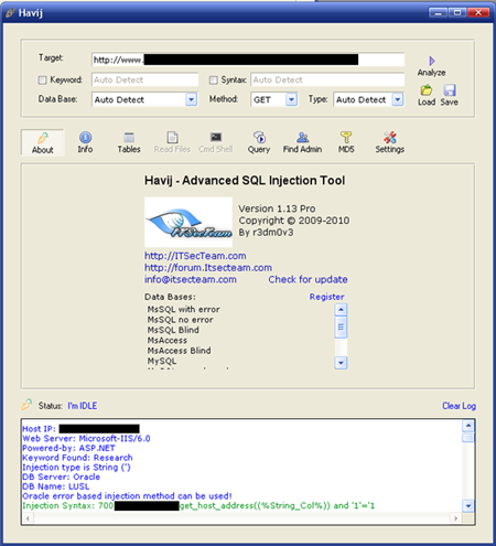 Havij是一款自動(dòng)化的SQL注入工具,它能夠幫助滲透測試人員發(fā)現(xiàn)和利用Web應(yīng)用程序的SQL注入漏洞。Havij不僅能夠自動(dòng)挖掘可利用的SQL 查詢,還能夠識(shí)別后臺(tái)數(shù)據(jù)庫類型、檢索數(shù)據(jù)的用戶名和密碼hash、轉(zhuǎn)儲(chǔ)表和列、從數(shù)據(jù)庫中提取數(shù)據(jù),甚至訪問底層文件系統(tǒng)和執(zhí)行系統(tǒng)命令,當(dāng)然前提是有 一個(gè)可利用的SQL注入漏洞。Havij支持廣泛的數(shù)據(jù)庫系統(tǒng),如 MsSQL, MySQL, MSAccess and Oracle。 Havij支持參數(shù)配置以躲避IDS,支持代理,后臺(tái)登陸地址掃描。