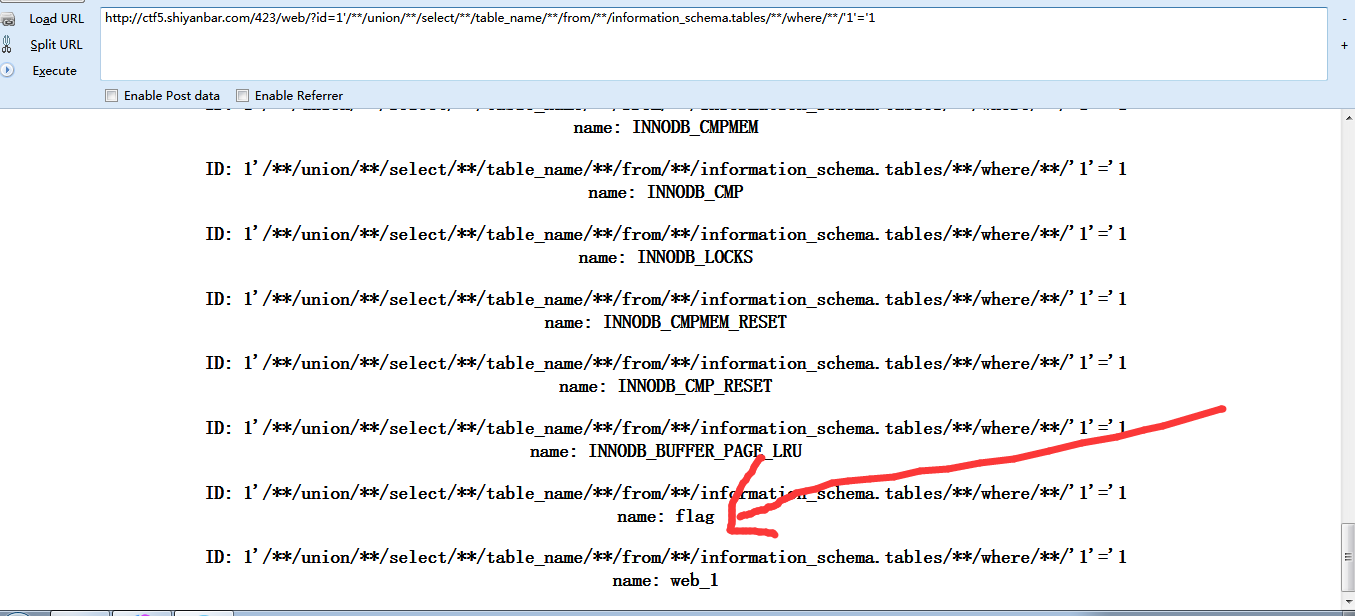 發(fā)現(xiàn)了flag的表,我們猜測應(yīng)該是在web1數(shù)據(jù)庫中并且字段就是flag(其實就在本頁面的數(shù)據(jù)庫中)